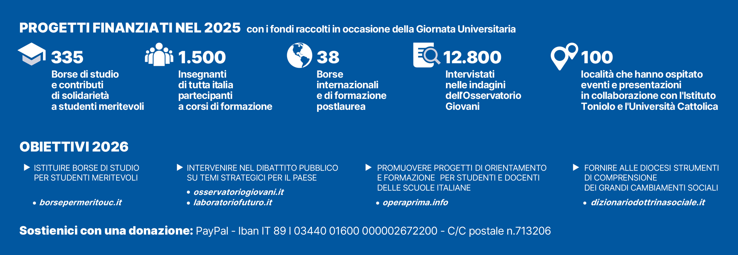 L’iniziativa, destinata a tutti gli studenti e i futuri studenti Unicatt, è promossa da Università Cattolica del Sacro Cuore e da Istituto Giuseppe Toniolo di Studi Superiori, ente fondatore dell’Ateneo, con la collaborazione di Fondazione EDUCatt per il Diritto allo Studio.